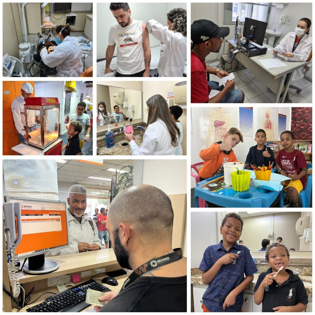 Além dele, muitos outros fizeram consultas em diversas especialidades, além de passarem por avaliação odontológica e fazerem limpeza dental. Para as crianças, teve aplicação de Flúor, além de oficina de escovação e orientação nutricional, sem contar com o espaço para brincadeiras e o lanchinho, que teve pipoca e algodão doce. Os adultos também tiveram a oportunidade de se vacinar, fazer verificação de pressão arterial, teste de glicose e cálculo de IMC. O serviço Social estava disponível, assim como orientação sobre exames. Também teve quem aproveitou para renovar os óculos, na ótica do Seconci. Cerca de 300 atendimentos foram realizados neste dia, entre 8h e 13h.